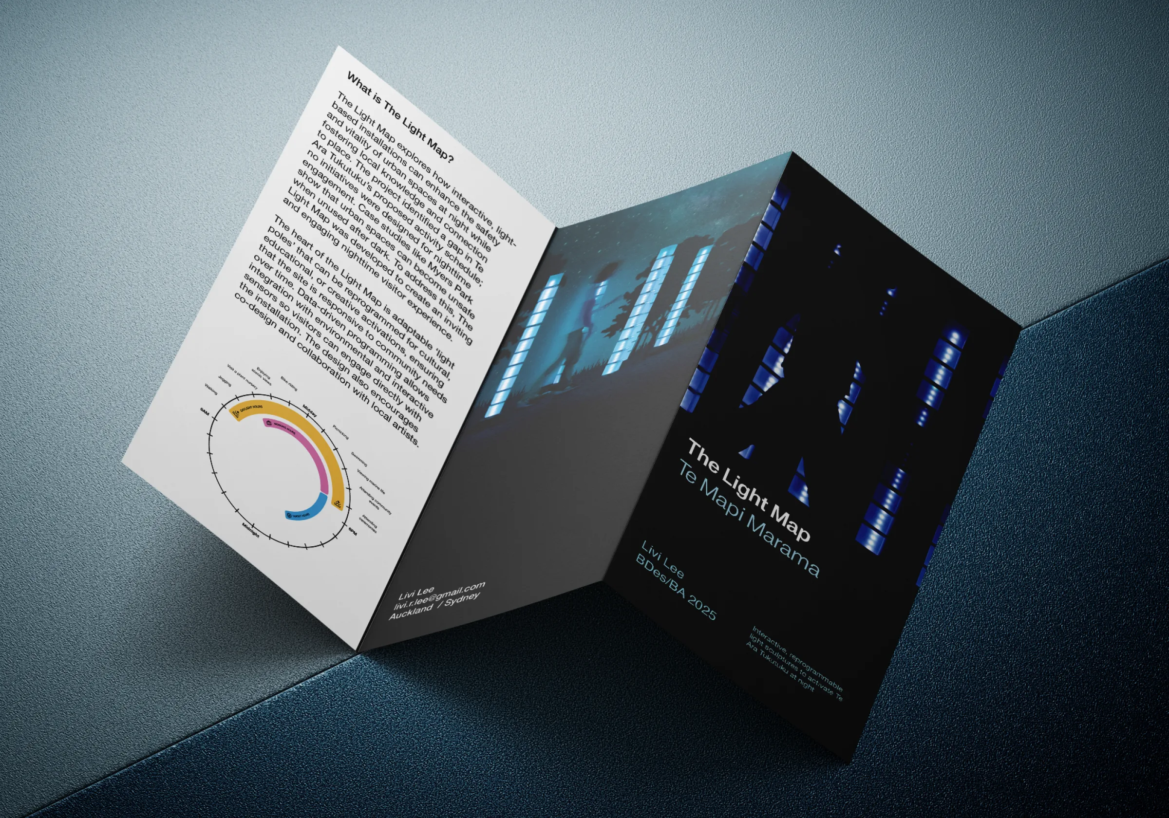 The Light Map explores how interactive, light-based installations can enhance the safety and vitality of urban spaces at night while fostering local knowledge and connection to place. The project identified a gap in Te Ara Tukutuku’s proposed activity schedule; no initiatives were designed for nighttime engagement. Case studies like Myers Park show that urban spaces can become unsafe when used after dark. To address this, The Light Map was developed to create an inviting and engaging nighttime visitor experience. I was incredibly grateful to recieve the Capstone Top in Course Award and Runner-Up in the LEXUS Design Award 2025 for this project.